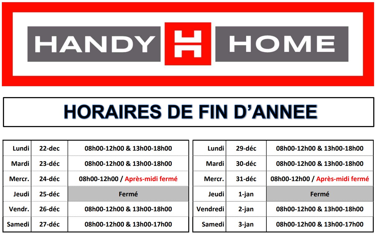 De HandyHome winkel biedt meer dan 1650 m² elektrisch gereedschap, bevestigingsmaterialen, hout, sanitair, siliconen, werkkledij, verf, leidingen, tuin, handgereedschap, elektriciteit, onderhoudsproducten, huishoud, fiets- en auto-accessoires, verlichting, decoratie, ...