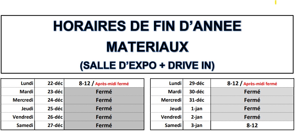 HORAIRES DE FIN D’ANNEE MATERIAUX (SALLE D’EXPO + DRIVE IN)